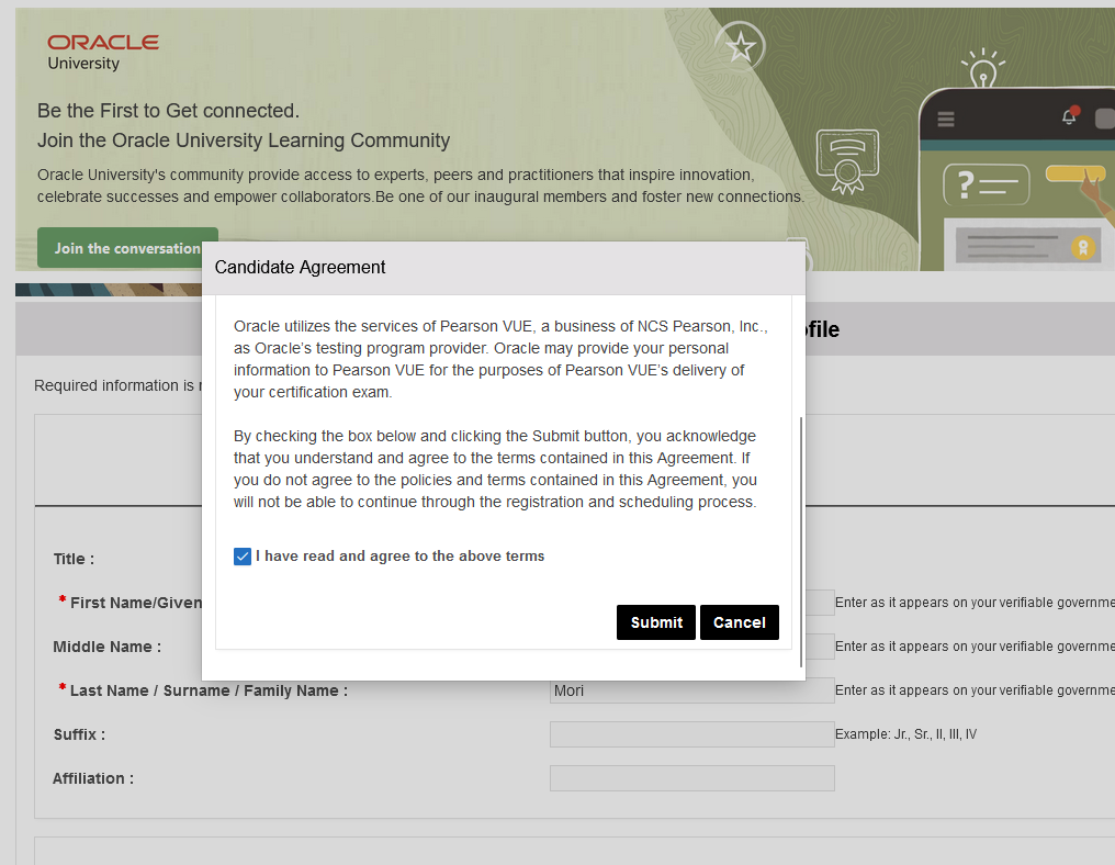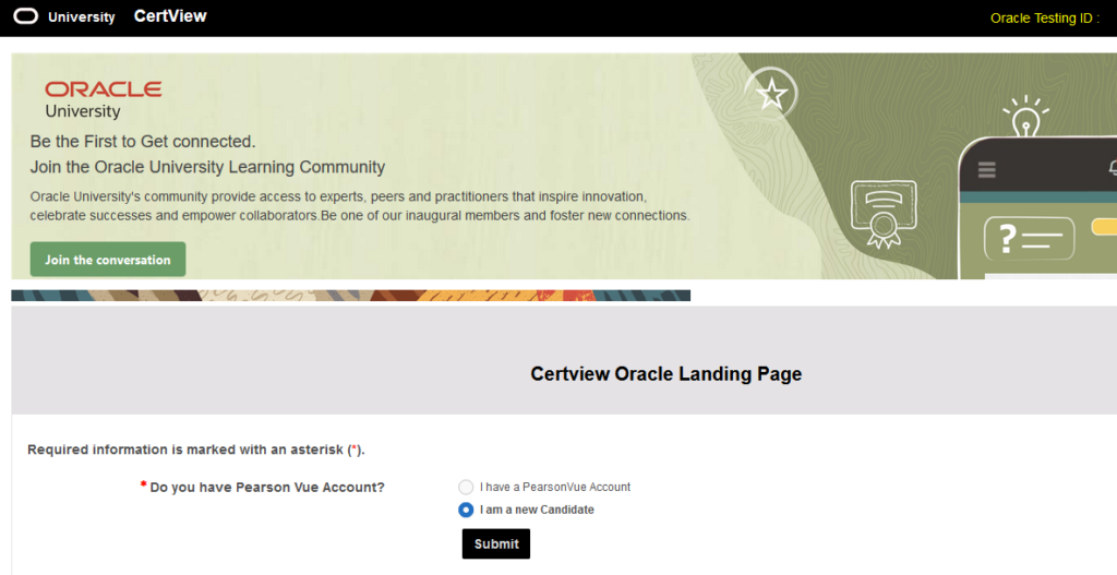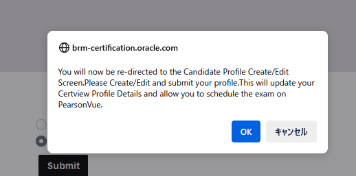 ピアソンVUEのアカウントアカウントを持っていないので、下のチェックボックスを選択肢「submit」をクリック。