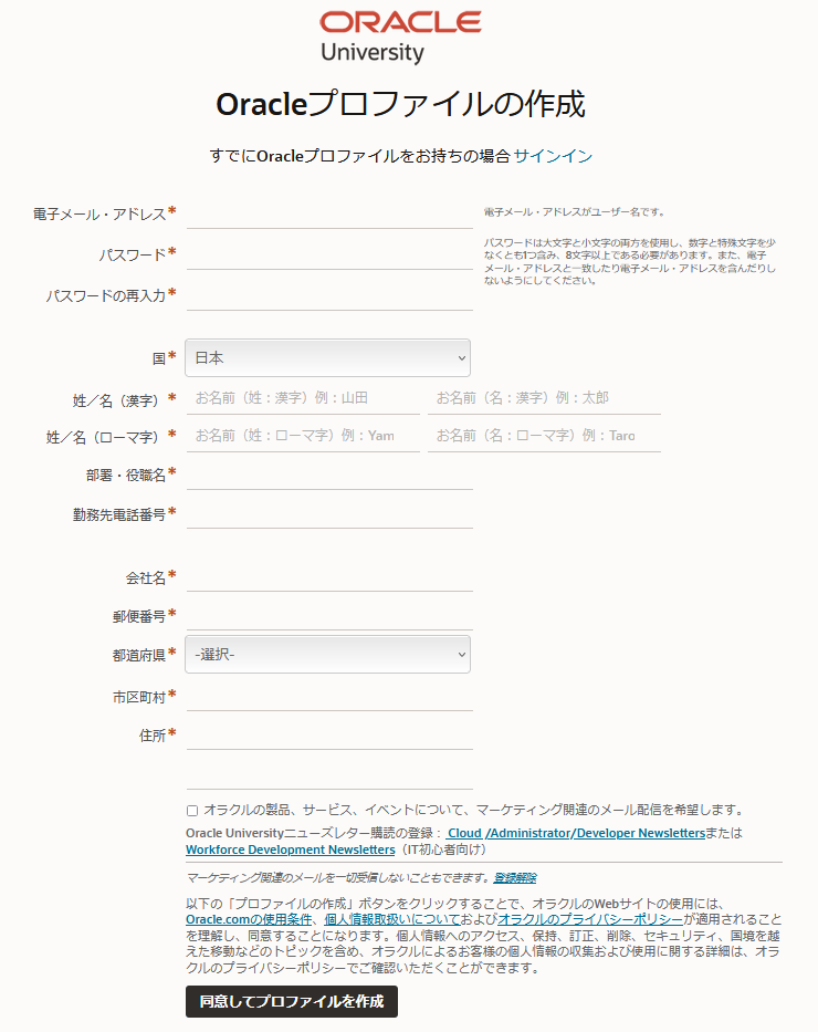 必要事項を記入し「同意してプロファイルを作成」をクリック。